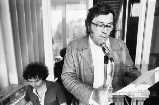 AZONOSÍTÓ: THM-BJ-00714 Férfi beszédet mond. [A szocialista brigádmozgalom szovjet mintára az 1950-es évek végén kezdett kibontakozni Magyarországon, és rendszerváltoztatáskor szűnt meg. Kezdetben csak az ipari üzemekben és gyárakban alakultak meg a brigádok, majd az agráriumban és a hivatali szférában is létrejöttek. A mozgalom jelszava: „Szocialista módon dolgozni, tanulni és élni” volt.] HELYSZÍN: Szekszárd, Tolna megye DÁTUM: 1977 FOTÓS: Bakó Jenő