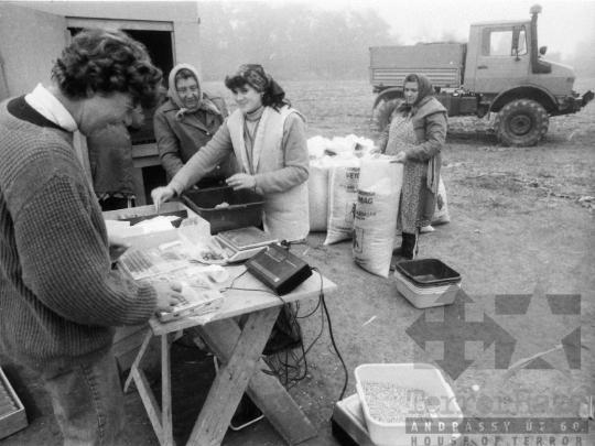 állami gazdaság kukorica vetőmag zsák teherautó mérleg pénztárgép kendő Dalmand Tolna megye Magyarország 1983 Bakó JenőFotó részletei