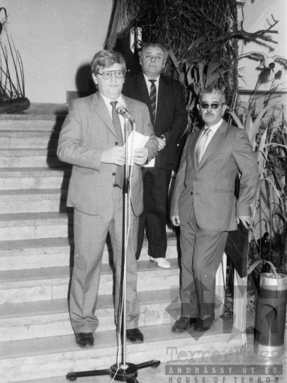 AZONOSÍTÓ: THM-BJ-00714 Férfi beszédet mond. [A szocialista brigádmozgalom szovjet mintára az 1950-es évek végén kezdett kibontakozni Magyarországon, és rendszerváltoztatáskor szűnt meg. Kezdetben csak az ipari üzemekben és gyárakban alakultak meg a brigádok, majd az agráriumban és a hivatali szférában is létrejöttek. A mozgalom jelszava: „Szocialista módon dolgozni, tanulni és élni” volt.] HELYSZÍN: Szekszárd, Tolna megye DÁTUM: 1977 FOTÓS: Bakó Jenő
