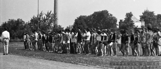 felvonulás pálya tornaruha transzparens tömegsport Szekszárd Tolna megye Magyarország 1962 Bakó JenőFotó részletei
