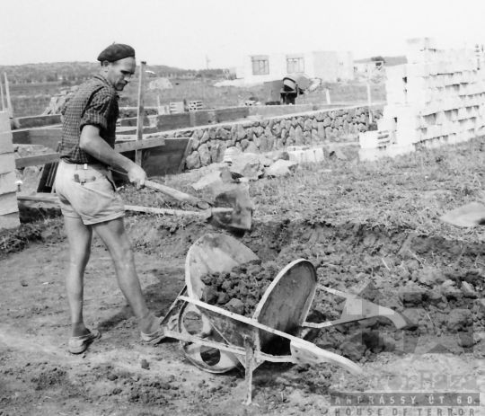 családi ház építkezés tégla talicska lapát svájcisapka Bátaszék Tolna megye Magyarország 1965 Bakó JenőFotó részletei
