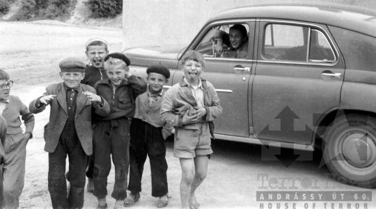 gyerek autó újságíró svájcisapka utcakép sajtó Györköny Tolna megye Magyarország 1965 Bakó JenőFotó részletei