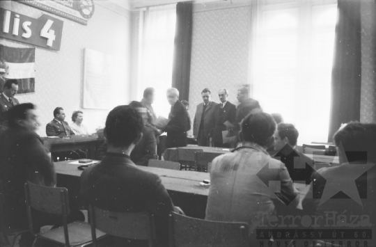 AZONOSÍTÓ: THM-BJ-00715 A rendezvény résztvevői. [A szocialista brigádmozgalom szovjet mintára az 1950-es évek végén kezdett kibontakozni Magyarországon, és rendszerváltoztatáskor szűnt meg. Kezdetben csak az ipari üzemekben és gyárakban alakultak meg a brigádok, majd az agráriumban és a hivatali szférában is létrejöttek. A mozgalom jelszava: „Szocialista módon dolgozni, tanulni és élni” volt.] HELYSZÍN: Szekszárd, Tolna megye DÁTUM: 1977 FOTÓS: Bakó Jenő