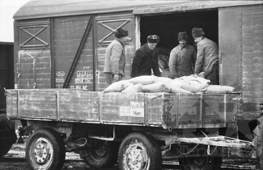 vagon tehervonat utánfutó pályaudvar zsák vasút termelőszövetkezet szerelvény szállítás Szekszárd Tolna megye Magyarország 1967 Bakó JenőFotó részletei