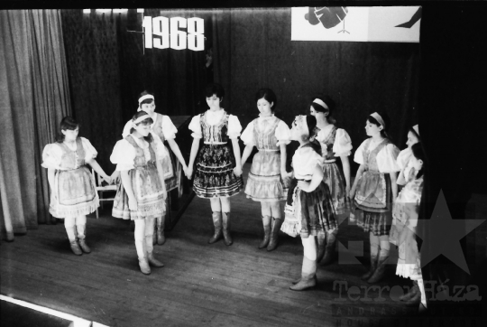 Ki Mit Tud? színpad néptánc népviselet versenyző vetélkedő Szekszárd Tolna megye Magyarország 1968 Bakó JenőFotó részletei