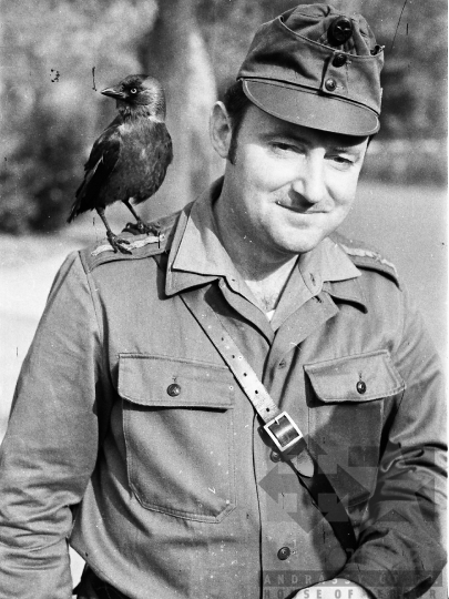 Tiszt vállán egy madárral.