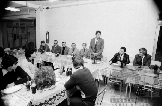 AZONOSÍTÓ: THM-BJ-00740 Zenészek asztal mellett játszanak. [TOTÉV: Tolna megyei Tatarozó és Építő Vállalat 1950. október végén a megyeszerte működő kisipari szövetkezetek összevonásával alakult meg, 1968 közepére szocialista középvállalattá nőtte ki magát Tm. Tanácsi Építőipari Vállalat néven.] HELYSZÍN: Szekszárd, Tolna megye DÁTUM: 1977 FOTÓS: Bakó Jenő