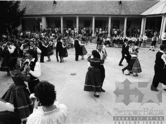 AZONOSÍTÓ: THM-BJ-00718 Néptánc produkció a színpadon - transzparenseken feliratok: "Hatékonyabb munkával a XI. pártkongresszus határozatainak következetes végrehajtásáért" "Munkánk minőségének és hatékonyságának javításával, többletvállalásokkal készülünk a NAGY OKT. SZOC. FORR. 60. évfordulójára". [Az októberi orosz forradalom (kommunista propagandában: nagy októberi szocialista forradalom) 1917. november 6–12. (október 24–30.) között zajlott, amelynek során a bolsevikok a Téli Palota ostroma után az ott székelő Ideiglenes Kormány tagjait letartóztatták, és Lenin vezetésével, akit a Népbiztosok Tanácsa elnökévé választottak, puccsal átvették a hatalmat. Hazánkban ez a nap 1950-től 1989-ig pártállami ünnep volt.] [A szocialista brigádmozgalom szovjet mintára az 1950-es évek végén kezdett kibontakozni Magyarországon, és rendszerváltoztatáskor szűnt meg. Kezdetben csak az ipari üzemekben és gyárakban alakultak meg a brigádok, majd az agráriumban és a hivatali szférában is létrejöttek. A mozgalom jelszava: „Szocialista módon dolgozni, tanulni és élni” volt.] HELYSZÍN: Szekszárd, Tolna megye DÁTUM: 1977 FOTÓS: Bakó Jenő