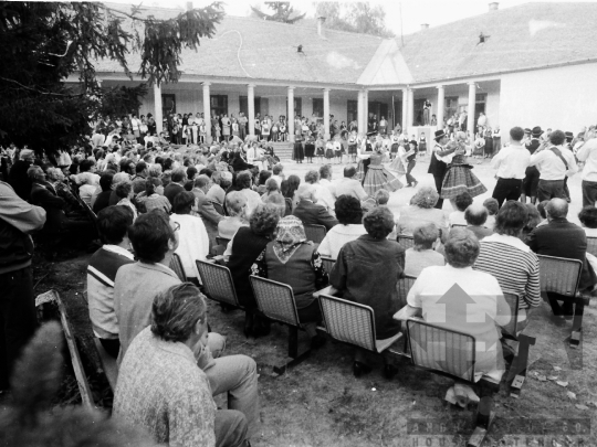 AZONOSÍTÓ: THM-BJ-00718 Néptánc produkció a színpadon - transzparenseken feliratok: "Hatékonyabb munkával a XI. pártkongresszus határozatainak következetes végrehajtásáért" "Munkánk minőségének és hatékonyságának javításával, többletvállalásokkal készülünk a NAGY OKT. SZOC. FORR. 60. évfordulójára". [Az októberi orosz forradalom (kommunista propagandában: nagy októberi szocialista forradalom) 1917. november 6–12. (október 24–30.) között zajlott, amelynek során a bolsevikok a Téli Palota ostroma után az ott székelő Ideiglenes Kormány tagjait letartóztatták, és Lenin vezetésével, akit a Népbiztosok Tanácsa elnökévé választottak, puccsal átvették a hatalmat. Hazánkban ez a nap 1950-től 1989-ig pártállami ünnep volt.] [A szocialista brigádmozgalom szovjet mintára az 1950-es évek végén kezdett kibontakozni Magyarországon, és rendszerváltoztatáskor szűnt meg. Kezdetben csak az ipari üzemekben és gyárakban alakultak meg a brigádok, majd az agráriumban és a hivatali szférában is létrejöttek. A mozgalom jelszava: „Szocialista módon dolgozni, tanulni és élni” volt.] HELYSZÍN: Szekszárd, Tolna megye DÁTUM: 1977 FOTÓS: Bakó Jenő