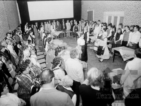 AZONOSÍTÓ: THM-BJ-00716 A rendezvény résztvevői. [A szocialista brigádmozgalom szovjet mintára az 1950-es évek végén kezdett kibontakozni Magyarországon, és rendszerváltoztatáskor szűnt meg. Kezdetben csak az ipari üzemekben és gyárakban alakultak meg a brigádok, majd az agráriumban és a hivatali szférában is létrejöttek. A mozgalom jelszava: „Szocialista módon dolgozni, tanulni és élni” volt.] HELYSZÍN: Szekszárd, Tolna megye DÁTUM: 1977 FOTÓS: Bakó Jenő