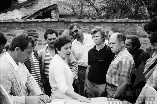 AZONOSÍTÓ: THM-BJ-00717 Férfi beszédet mond - transzparensen felirat: "Munkánk minőségének és hatékonyságának javításával, többletvállalásokkal készülünk a NAGY OKT. SZOC. FORR. 60. évfordulójára". [Az októberi orosz forradalom (kommunista propagandában: nagy októberi szocialista forradalom) 1917. november 6–12. (október 24–30.) között zajlott, amelynek során a bolsevikok a Téli Palota ostroma után az ott székelő Ideiglenes Kormány tagjait letartóztatták, és Lenin vezetésével, akit a Népbiztosok Tanácsa elnökévé választottak, puccsal átvették a hatalmat. Hazánkban ez a nap 1950-től 1989-ig pártállami ünnep volt.] [A szocialista brigádmozgalom szovjet mintára az 1950-es évek végén kezdett kibontakozni Magyarországon, és rendszerváltoztatáskor szűnt meg. Kezdetben csak az ipari üzemekben és gyárakban alakultak meg a brigádok, majd az agráriumban és a hivatali szférában is létrejöttek. A mozgalom jelszava: „Szocialista módon dolgozni, tanulni és élni” volt.] HELYSZÍN: Szekszárd, Tolna megye DÁTUM: 1977 FOTÓS: Bakó Jenő