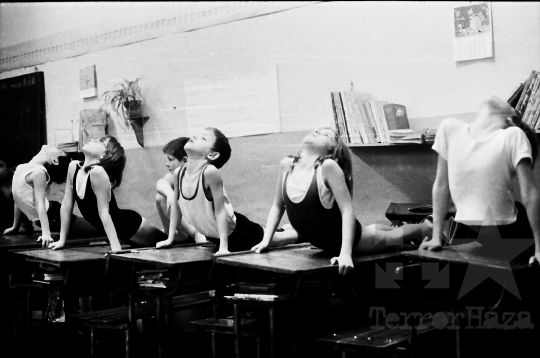 általános iskola iskola tornaóra tanterem osztály iskolapad diák tornaruha Mórágy Tolna megye Magyarország 1986 Bakó JenőFotó részletei