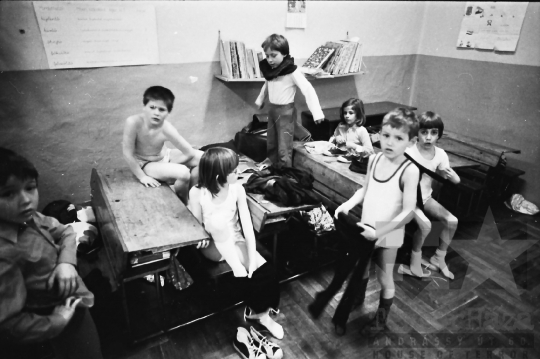általános iskola iskola tornaóra tanterem osztály diák könyv tornaruha iskolapad Mórágy Tolna megye Magyarország 1986 Bakó JenőFotó részletei