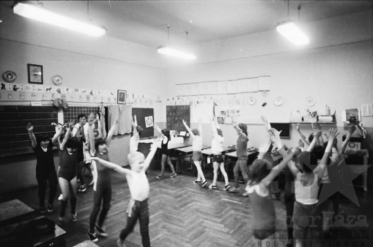 általános iskola iskola tornaóra tanterem osztály diák tábla tanár tornaruha iskolapad Mórágy Tolna megye Magyarország 1986 Bakó JenőFotó részletei