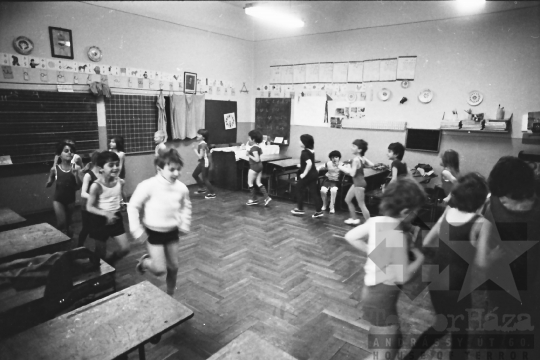általános iskola iskola tornaóra tanterem osztály diák tábla tornaruha iskolapad Mórágy Tolna megye Magyarország 1986 Bakó JenőFotó részletei