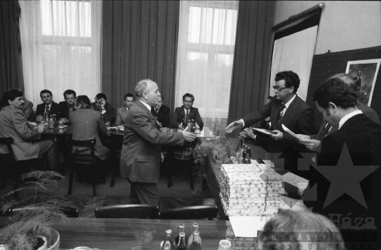 AZONOSÍTÓ: THM-BJ-00714 Férfi beszédet mond. [A szocialista brigádmozgalom szovjet mintára az 1950-es évek végén kezdett kibontakozni Magyarországon, és rendszerváltoztatáskor szűnt meg. Kezdetben csak az ipari üzemekben és gyárakban alakultak meg a brigádok, majd az agráriumban és a hivatali szférában is létrejöttek. A mozgalom jelszava: „Szocialista módon dolgozni, tanulni és élni” volt.] HELYSZÍN: Szekszárd, Tolna megye DÁTUM: 1977 FOTÓS: Bakó Jenő