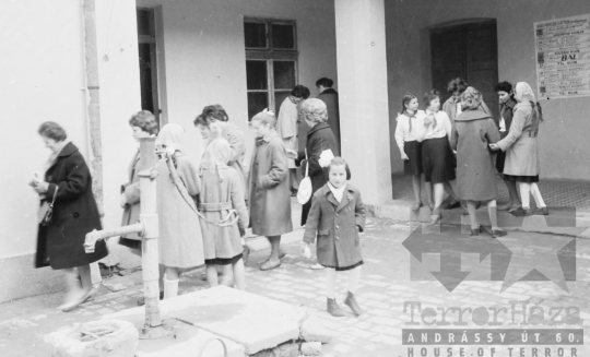 AZONOSÍTÓ: THM-BJ-00466 Férfi asszonyokat köszönt virággal a gyár bejáratánál. [A nemzetközi nőnap szovjet mintára Magyarországon 1948-tól egészen a rendszerváltoztatásig kötelező ünnepnap volt március 8-án.] [A Tolnai Selyemfonógyárat 1900-ben Bezerédj Pál alapította. A gyár fő profilja a természetes selyemszálak gyártása volt. 1948-ban államosították, majd az 1955-ben megalakított Magyar Selyemipar Vállalathoz csatolták. 1970-ben megszűnt a selyemfonás, helyette szintetikus szövetek gyártása folyt. 1991-ben privatizálták.] HELYSZÍN: Tolna, Tolna megye DÁTUM: 1977 FOTÓS: Bakó Jenő