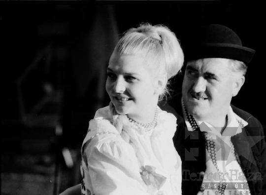 AZONOSÍTÓ: THM-BJ-00718 Néptánc produkció a színpadon - transzparenseken feliratok: "Hatékonyabb munkával a XI. pártkongresszus határozatainak következetes végrehajtásáért" "Munkánk minőségének és hatékonyságának javításával, többletvállalásokkal készülünk a NAGY OKT. SZOC. FORR. 60. évfordulójára". [Az októberi orosz forradalom (kommunista propagandában: nagy októberi szocialista forradalom) 1917. november 6–12. (október 24–30.) között zajlott, amelynek során a bolsevikok a Téli Palota ostroma után az ott székelő Ideiglenes Kormány tagjait letartóztatták, és Lenin vezetésével, akit a Népbiztosok Tanácsa elnökévé választottak, puccsal átvették a hatalmat. Hazánkban ez a nap 1950-től 1989-ig pártállami ünnep volt.] [A szocialista brigádmozgalom szovjet mintára az 1950-es évek végén kezdett kibontakozni Magyarországon, és rendszerváltoztatáskor szűnt meg. Kezdetben csak az ipari üzemekben és gyárakban alakultak meg a brigádok, majd az agráriumban és a hivatali szférában is létrejöttek. A mozgalom jelszava: „Szocialista módon dolgozni, tanulni és élni” volt.] HELYSZÍN: Szekszárd, Tolna megye DÁTUM: 1977 FOTÓS: Bakó Jenő
