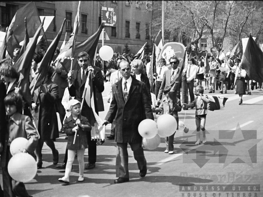 szocialista állami ünnep május 1. munka ünnepe gyerek lufi zászló Szekszárd Tolna megye Magyarország 1976 Bakó JenőFotó részletei