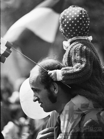 szocialista állami ünnep május 1. munka ünnepe gyerek lufi papírzászló Szekszárd Tolna megye Magyarország 1976 Bakó JenőFotó részletei