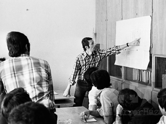 AZONOSÍTÓ: THM-BJ-00717 Férfi beszédet mond - transzparensen felirat: "Munkánk minőségének és hatékonyságának javításával, többletvállalásokkal készülünk a NAGY OKT. SZOC. FORR. 60. évfordulójára". [Az októberi orosz forradalom (kommunista propagandában: nagy októberi szocialista forradalom) 1917. november 6–12. (október 24–30.) között zajlott, amelynek során a bolsevikok a Téli Palota ostroma után az ott székelő Ideiglenes Kormány tagjait letartóztatták, és Lenin vezetésével, akit a Népbiztosok Tanácsa elnökévé választottak, puccsal átvették a hatalmat. Hazánkban ez a nap 1950-től 1989-ig pártállami ünnep volt.] [A szocialista brigádmozgalom szovjet mintára az 1950-es évek végén kezdett kibontakozni Magyarországon, és rendszerváltoztatáskor szűnt meg. Kezdetben csak az ipari üzemekben és gyárakban alakultak meg a brigádok, majd az agráriumban és a hivatali szférában is létrejöttek. A mozgalom jelszava: „Szocialista módon dolgozni, tanulni és élni” volt.] HELYSZÍN: Szekszárd, Tolna megye DÁTUM: 1977 FOTÓS: Bakó Jenő