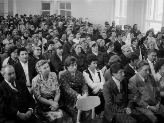 AZONOSÍTÓ: THM-BJ-00716 A rendezvény résztvevői. [A szocialista brigádmozgalom szovjet mintára az 1950-es évek végén kezdett kibontakozni Magyarországon, és rendszerváltoztatáskor szűnt meg. Kezdetben csak az ipari üzemekben és gyárakban alakultak meg a brigádok, majd az agráriumban és a hivatali szférában is létrejöttek. A mozgalom jelszava: „Szocialista módon dolgozni, tanulni és élni” volt.] HELYSZÍN: Szekszárd, Tolna megye DÁTUM: 1977 FOTÓS: Bakó Jenő