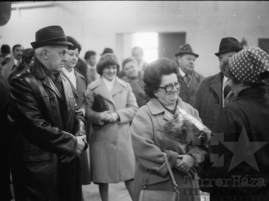 AZONOSÍTÓ: THM-BJ-00468 Férfi asszonyokat köszönt virággal a gyár bejáratánál. [A nemzetközi nőnap szovjet mintára Magyarországon 1948-tól egészen a rendszerváltoztatásig kötelező ünnepnap volt március 8-án.] [A Tolnai Selyemfonógyárat 1900-ben Bezerédj Pál alapította. A gyár fő profilja a természetes selyemszálak gyártása volt. 1948-ban államosították, majd az 1955-ben megalakított Magyar Selyemipar Vállalathoz csatolták. 1970-ben megszűnt a selyemfonás, helyette szintetikus szövetek gyártása folyt. 1991-ben privatizálták.] HELYSZÍN: Tolna, Tolna megye DÁTUM: 1977 FOTÓS: Bakó Jenő