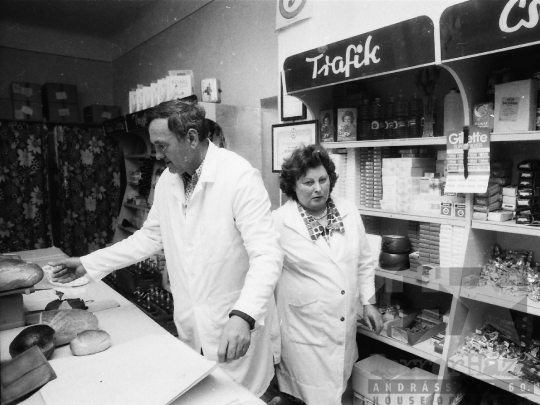 bolt üzlet trafik köpeny cigaretta borotva Gillette oklevél sajt cipó pult Tomi mosószer eladó népbolt Keszőhidegkút Tolna megye Magyarország 1980 Bakó JenőFotó részletei