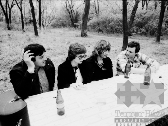 AZONOSÍTÓ: THM-BJ-00740 Zenészek asztal mellett játszanak. [TOTÉV: Tolna megyei Tatarozó és Építő Vállalat 1950. október végén a megyeszerte működő kisipari szövetkezetek összevonásával alakult meg, 1968 közepére szocialista középvállalattá nőtte ki magát Tm. Tanácsi Építőipari Vállalat néven.] HELYSZÍN: Szekszárd, Tolna megye DÁTUM: 1977 FOTÓS: Bakó Jenő