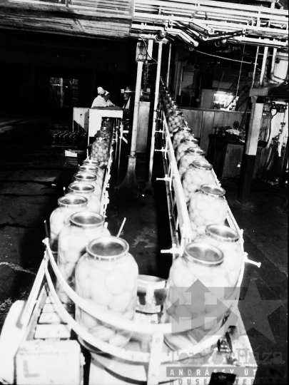 konzervgyár töltőüzem szállítószalag befőttes üveg savanyúság almapaprika Paks Tolna megye Magyarország 1981 Bakó JenőFotó részletei