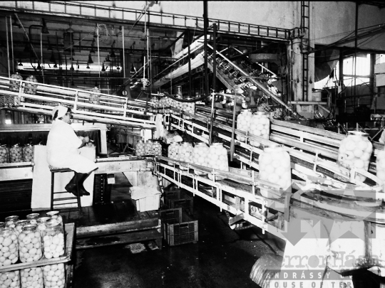 konzervgyár töltőüzem szállítószalag befőttes üveg savanyúság almapaprika Paks Tolna megye Magyarország 1981 Bakó JenőFotó részletei
