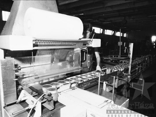 konzervgyár fóliázás szállítószalag Globus konzerv Paks Tolna megye Magyarország 1981 Bakó JenőFotó részletei