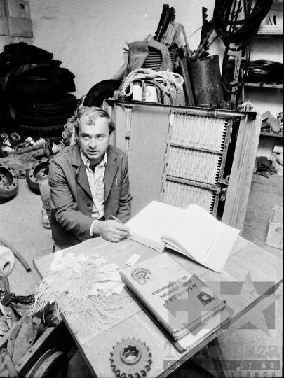 AZONOSÍTÓ: THM-BJ-00717 Férfi beszédet mond - transzparensen felirat: "Munkánk minőségének és hatékonyságának javításával, többletvállalásokkal készülünk a NAGY OKT. SZOC. FORR. 60. évfordulójára". [Az októberi orosz forradalom (kommunista propagandában: nagy októberi szocialista forradalom) 1917. november 6–12. (október 24–30.) között zajlott, amelynek során a bolsevikok a Téli Palota ostroma után az ott székelő Ideiglenes Kormány tagjait letartóztatták, és Lenin vezetésével, akit a Népbiztosok Tanácsa elnökévé választottak, puccsal átvették a hatalmat. Hazánkban ez a nap 1950-től 1989-ig pártállami ünnep volt.] [A szocialista brigádmozgalom szovjet mintára az 1950-es évek végén kezdett kibontakozni Magyarországon, és rendszerváltoztatáskor szűnt meg. Kezdetben csak az ipari üzemekben és gyárakban alakultak meg a brigádok, majd az agráriumban és a hivatali szférában is létrejöttek. A mozgalom jelszava: „Szocialista módon dolgozni, tanulni és élni” volt.] HELYSZÍN: Szekszárd, Tolna megye DÁTUM: 1977 FOTÓS: Bakó Jenő