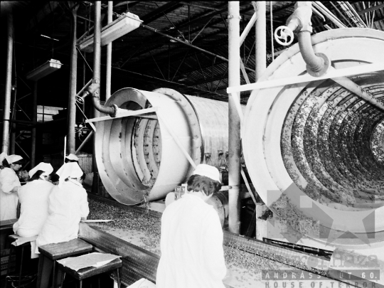 konzervgyár üzemcsarnok szállítószalag zöldség Paks Tolna megye Magyarország 1981 Bakó JenőFotó részletei