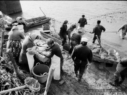 halász halászháló csónak kendő hal vödör halászat Tamási Tolna megye Magyarország 1982 Bakó JenőFotó részletei