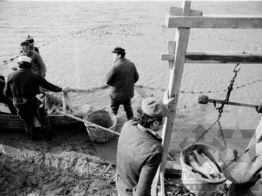 halász halászháló csónak hal mérleg svájcisapka halászat Tamási Tolna megye Magyarország 1982 Bakó JenőFotó részletei