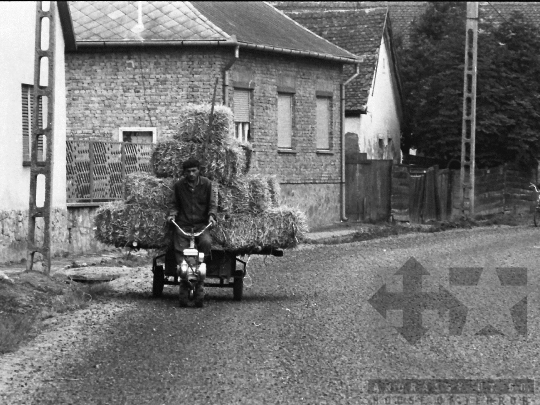 utcakép szénabála svájcisapka motoros utánfutó Báta Tolna megye Magyarország 1985 Bakó JenőFotó részletei