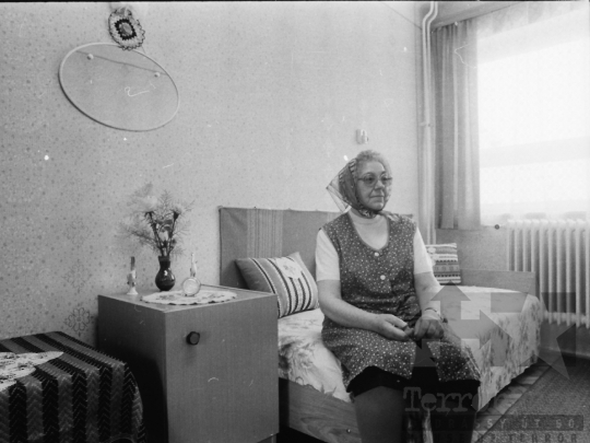 szociális otthon szociális ellátás öregség tükör otthonka bútor díszpárna Decs Tolna megye Magyarország 1985 Bakó JenőFotó részletei