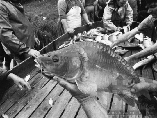termelőszövetkezet kötény hal halászat Tamási Tolna megye Magyarország 1985 Bakó JenőFotó részletei