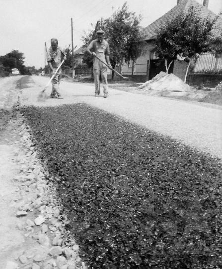 utcakép útépítés aszfalt lapát svájcisapka Szekszárd Tolna megye Magyarország 1985 Bakó JenőFotó részletei