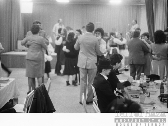 AZONOSÍTÓ: THM-BJ-00740 Zenészek asztal mellett játszanak. [TOTÉV: Tolna megyei Tatarozó és Építő Vállalat 1950. október végén a megyeszerte működő kisipari szövetkezetek összevonásával alakult meg, 1968 közepére szocialista középvállalattá nőtte ki magát Tm. Tanácsi Építőipari Vállalat néven.] HELYSZÍN: Szekszárd, Tolna megye DÁTUM: 1977 FOTÓS: Bakó Jenő
