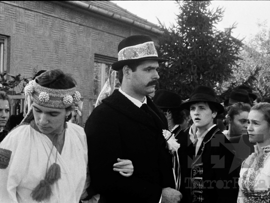 esküvő házasság család népviselet vőlegény pántlikás kalap párta ünnepség Szekszárd Tolna megye Magyarország 1987 Bakó JenőFotó részletei