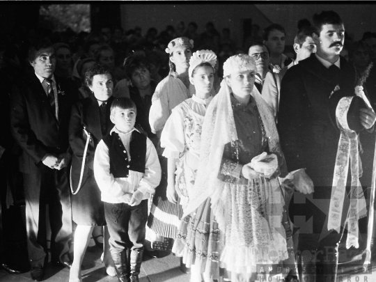 esküvő házasság család népviselet násznép menyasszony vőlegény pántlikás kalap gyerek ünnepség Szekszárd Tolna megye Magyarország 1987 Bakó JenőFotó részletei