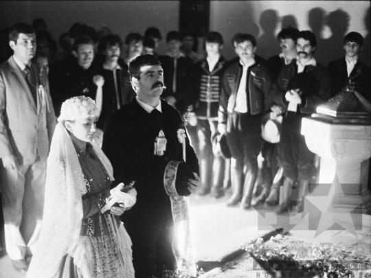 esküvő házasság család népviselet ünnepség násznép menyasszony vőlegény pántlikás kalap Szekszárd Tolna megye Magyarország 1987 Bakó JenőFotó részletei