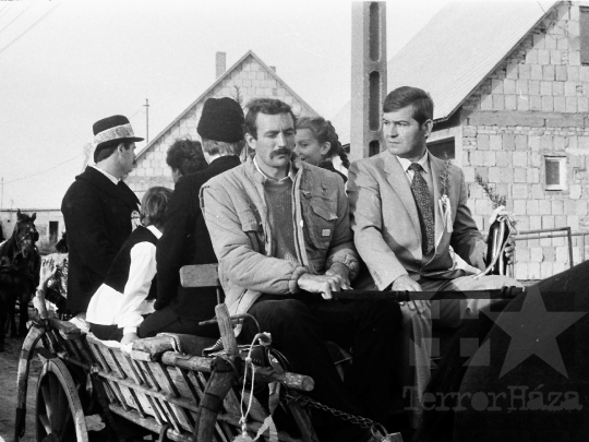 esküvő házasság család népviselet ünnepség násznép pántlikás kalap szekér Szekszárd Tolna megye Magyarország 1987 Bakó JenőFotó részletei