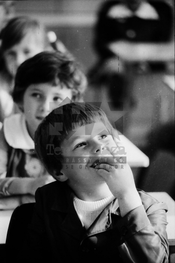 diák iskola általános iskola iskolapad tanterem köpeny osztály Szekszárd Tolna megye Magyarország 1976 Bakó JenőFotó részletei