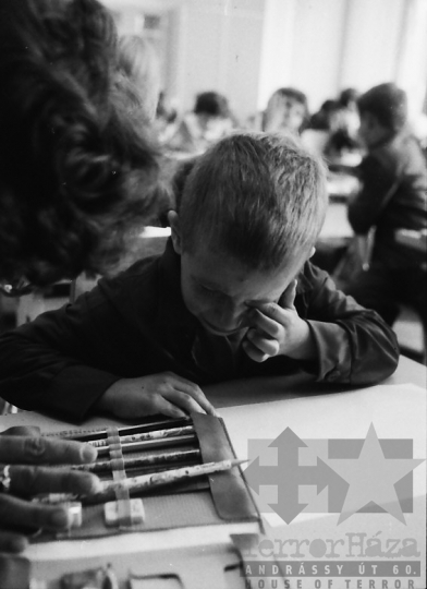 diák iskola általános iskola tanterem köpeny iskolapad osztály tolltartó Szekszárd Tolna megye Magyarország 1976 Bakó JenőFotó részletei