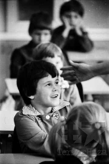 diák iskola általános iskola tanterem köpeny iskolapad osztály Szekszárd Tolna megye Magyarország 1976 Bakó JenőFotó részletei