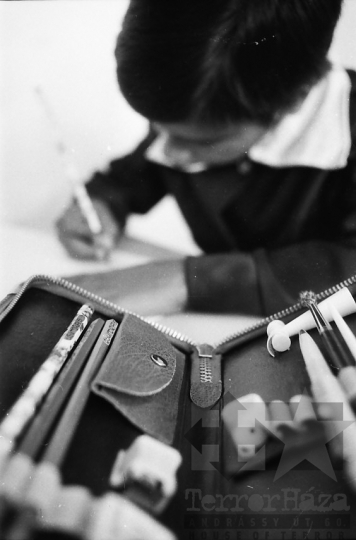 diák iskola általános iskola köpeny tolltartó ceruza Szekszárd Tolna megye Magyarország 1976 Bakó JenőFotó részletei