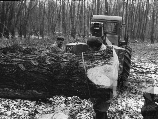 fakitermelés fafeldolgozás farönk traktor erdészet faipar Pörböly Tolna megye Magyarország 1976 Bakó JenőFotó részletei